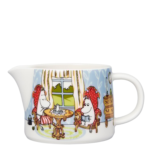Liten kanna med illustration av Muminmamma och Mumintrollet en eftermiddag i Muminhusets salong. Muminmamma stickar medan Mumintrollet läser en bok. Kannan passar perfekt för till exempel mjölken till kaffet eller vaniljsåsen till äppelpajen.