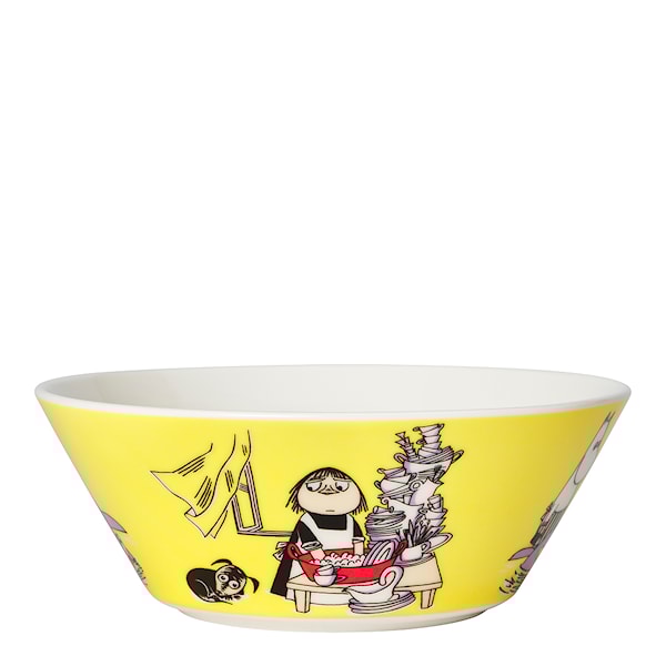 Våren 2020 kompletteras Muminservisen med en härligt pastellfärgad gul skål med den till en början lite buttra Misan.
