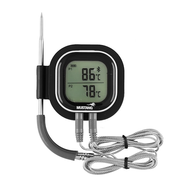 Med Mustangs digitala Bluetooth-termometer får du exakt kontroll över köttets innertemperatur, utan att behöva stå vid grillen hela tiden. Två temperaturgivare mäter upp till +300 °C och gör det enkelt att tillaga olika köttstycken samtidigt med perfekt resultat.