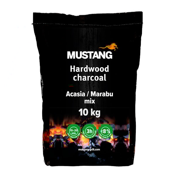 Mustangs blandning av akacia och marabou ger en högpresterande grillkol med exceptionell hållbarhet och stabil förbränning. Med en brinntid på cirka 3 timmar ger denna kol ett jämnt glödbäddslager som passar perfekt för både direkt- och indirekt grillning.