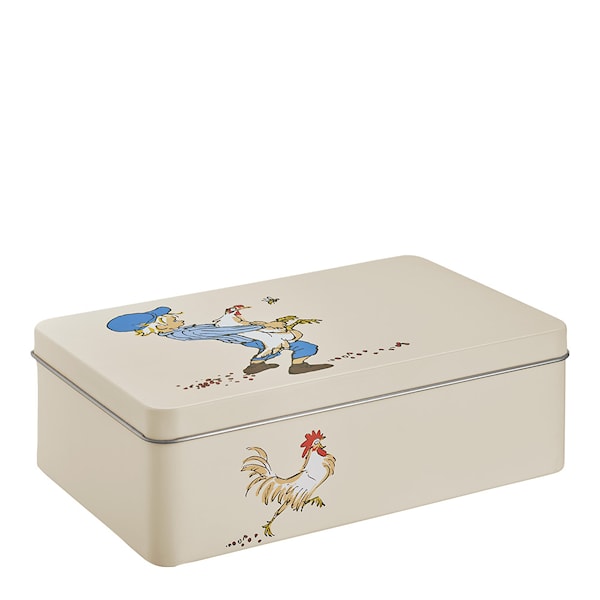 Emil i Lönneberga plåtburk 18x12 cm Cluck Cluck, från Muurla. Emil, den busiga och charmiga pojken från Astrid Lindgrens älskade böcker, pryder denna plåtask, Cluck Cluck, där han leker med hönsen på Katthults gård. Undrar du om hönorna också är lekfulla? Denna plåtask med lock är perfekt för att organisera små skatter och prydnadssaker i barnrummet, på skrivbordet, köksbänken eller var som helst – den ger extra förvaring där det behövs.