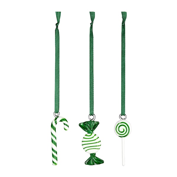 Muurlas godisformade julpynt i 3-pack består av tre handgjorda glasfigurer som föreställer polkagris, klubba och karamell. De är ungefär 8 cm höga och passar utmärkt i julgranen, men kan också hängas i fönstret eller användas som små blickfång i juldukningen.