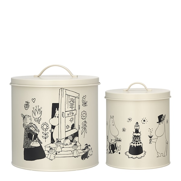 Med Moomin for Pets burk 2-pack "Mumin 80 år benvit/svart" från Muurla får du två vackra och praktiska plåtburkar för förvaring av torrfoder eller godsaker till ditt husdjur. De dekorativa burkarna, med motiv från Mumindalen, tillför en lekfull och stilren touch till hemmet. För att bevara finishen rekommenderas handdisk och noggrann torkning.