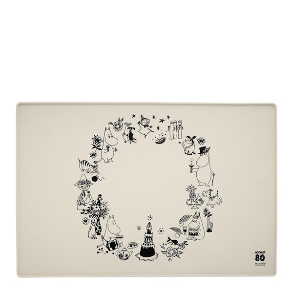 Moomin for Pets silikonmatta 60x40 cm "Mumin 80 år benvit/svart" från Muurla är en smart och dekorativ lösning för husdjurens matplats. Silikonmaterialet håller matskålarna stadigt på plats och skyddar golvet från spill. Den upphöjda kanten på 1 cm fångar effektivt upp vatten och matrester, vilket gör den både praktisk och hygienisk. Mattan är enkel att rengöra och kan till och med diskas i maskin.