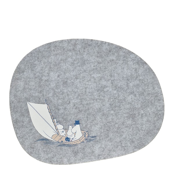 Mumin bordstablett Sjömän från Muurla, med måtten 38x31 cm, är en del av den nautiskt inspirerade kollektionen Mumin Sjömän. Serien präglas av ett klassiskt vitt och blått färgtema med charmiga Mumindetaljer som för tankarna till Tove Janssons kärlek till havet, ett återkommande tema i hennes Muminberättelser och illustrationer. Bordstabletten är tillverkad av ett filtliknande, mycket lätt material som skapats av återvunnen plast, vilket gör den både hållbar och miljövänlig. Den har en lekfull asymmetrisk form, som påminner om en sten vid stranden, vilket ger en unik och naturlig känsla till din dukning.
