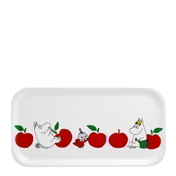 Denna stora Mumin serveringsbricka från Muurla är en handgjord bricka i björkfanér med ett vackert och färgstarkt motiv från serien Mumin Joyful Apples. Brickan mäter 43x22 cm och erbjuder gott om plats för servering av frukost, fika eller större uppläggningar.