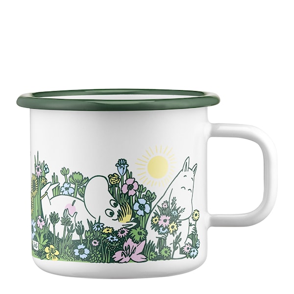 Mumin emaljmugg 37 cl "I trädgården vit" från Muurla är en lätt och hållbar mugg som passar lika bra hemma som på äventyr. Muggen är tillverkad av kolstål med en dubbel beläggning av emalj, vilket gör den tålig och reptålig. Perfekt för både varma och kalla drycker, och tack vare sin lätta vikt är den enkel att ta med på picknick, camping eller andra utflykter. Dessutom är muggen enkel att rengöra och tål maskindisk, men den får ej användas i mikrovågsugn.