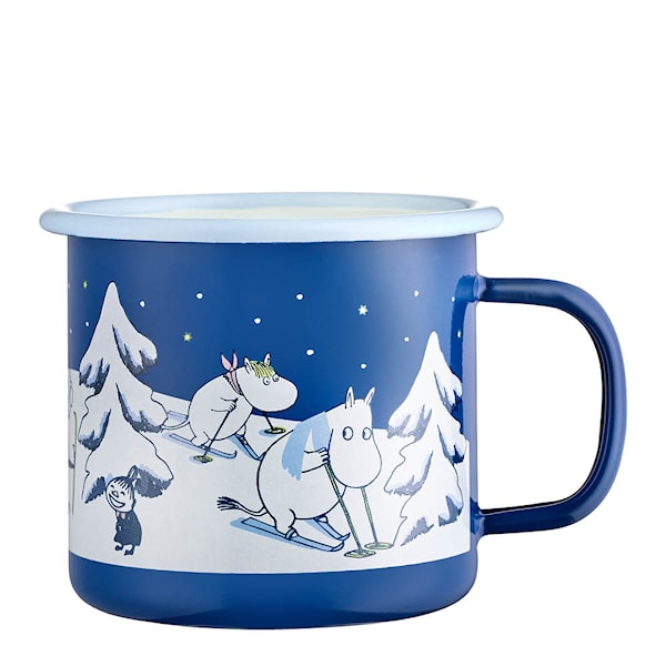 Denna robusta emaljmugg från Muurla är en Muminmugg tillverkad i kolstål med dubbla lager emalj, vilket gör den extra slitstark men samtidigt lätt att bära med sig. Den rymmer 37 cl och fungerar utmärkt för både varm choklad och kalla drycker. Tål diskmaskin, men inte mikrovågsugn.