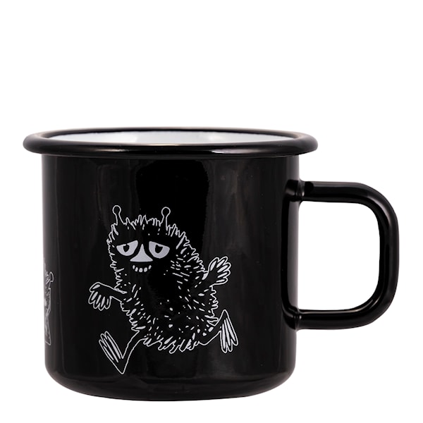 Svart Emaljerad stålmugg i serien Mumin från Muurla. På muggen ser vi den lilla Stinky som hela tiden hittar på rackartyg.