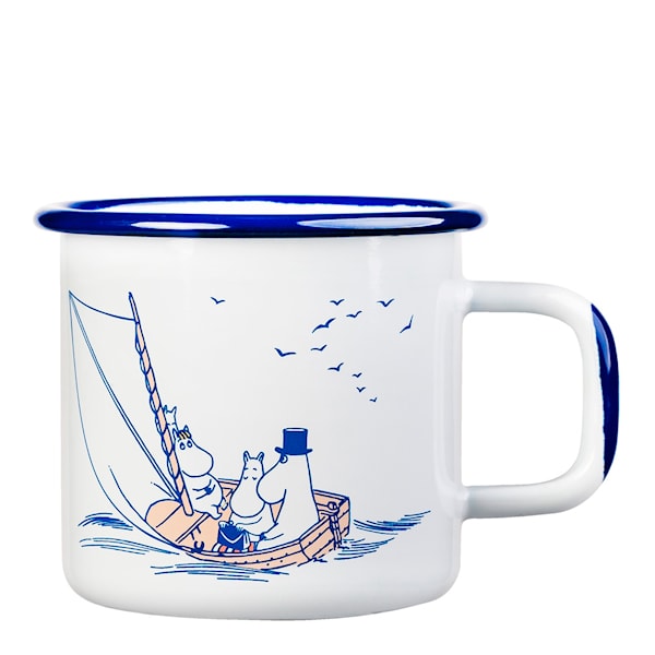 Mumin Emaljmugg Sailors 3,7 dl Vit är den större muggen ur serien från Muurla. Med motiv av Tove Janssons älskade Muminfamilj ute på äventyr - denna gången på havet. En rejäl vit mugg, med effektfulla blå detaljer, att dricka ditt kaffe ur vid frukostbordet, i sommarstugan eller vid en lägereld.