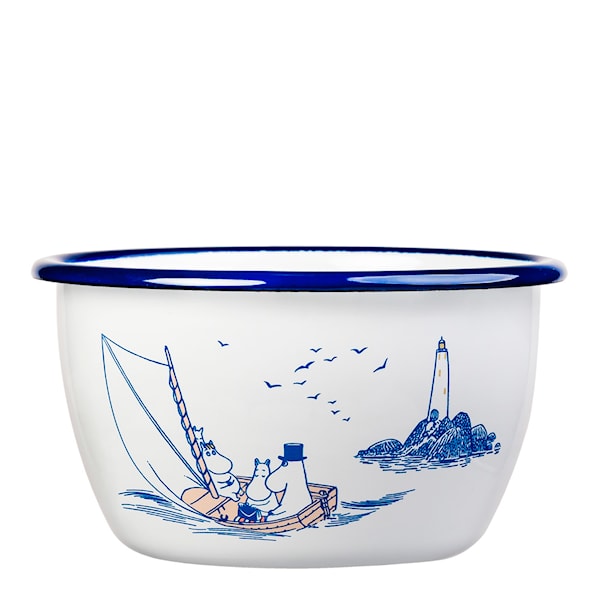 Mumin Emaljskål Sailors 6 dl Vit från Muurla med motiv av Tove Janssons älskade Mumintroll ute till havs. I bakgrunden ser vi en fyr, kanske den där familjen bodde den sommaren Muminpappan skulle skriva sin stora roman?