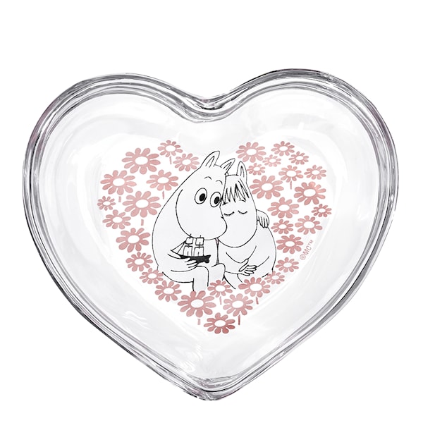 Med Mumin glasburk med lock "Tillsammans rosa" får du en hjärtformad skål som är både praktisk och dekorativ. Den passar perfekt för att förvara smycken, servera godsaker eller hålla ordning på små leksaker. Glasburken, som mäter 5,5 cm på höjden och 11,5 cm i bredd, har ett fint Muminmotiv på locket och levereras i en vacker presentförpackning.