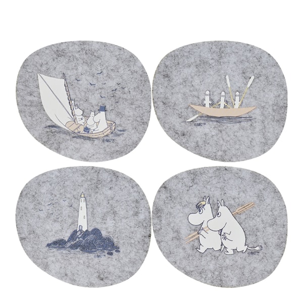 Mumin glasunderlägg Sjömän från Muurla är ett 4-pack som ingår i den nautiskt inspirerade kollektionen Mumin Sjömän. Denna serie kombinerar ett klassiskt vitt och blått färgtema med charmiga detaljer från Mumindalen. Havet spelar en central roll i Tove Janssons Muminberättelser och illustrationer, och detta tema är tydligt närvarande i denna kollektion. Glasunderläggen är tillverkade av ett filtliknande, lätt material som skapats av återvunnen plast, vilket gör dem både hållbara och miljövänliga. Setet innehåller fyra asymmetriska underlägg, var och en med sitt eget unika Muminmotiv, vilket gör dem till ett lekfullt och praktiskt tillskott till ditt hem.