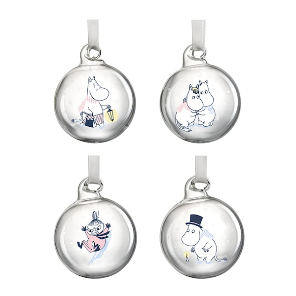 Mumin julkulor 4-pack Låt det snöa från Muurla är ett set med fyra charmiga glasdekorationer som adderar en lekfull touch till julens inredning. Varje kula har en diameter på 5 cm och pryds med fina motiv av Mumin, Snorkfröken, Lilla My, Muminmamman och Muminpappan, vilket ger varje kula sin egen unika karaktär. Handgjorda av glas och utrustade med satinband, är dessa kulor perfekta att hänga i julgranen, i fönstret eller på gardinen. De sprider en stämningsfull och nostalgisk känsla som passar både stora och små, och blir ett älskat inslag bland julens dekorationer.
