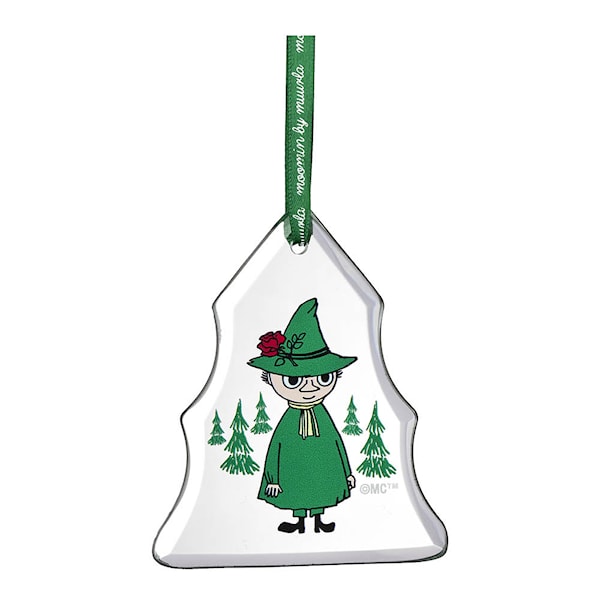 Mumin julpynt från Muurla är en dekorativ, granformad glasprydnad på 6,5 cm med ett fint motiv av Snusmumriken. Prydnaden levereras med satinband för enkel upphängning i granen, i fönstret eller på annan plats där den får lysa upp hemmet.