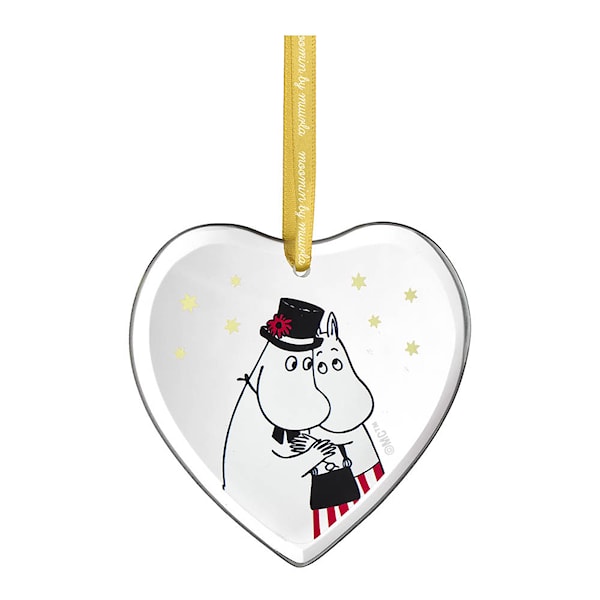 Mumin julpynt från Muurla är en platt, hjärtformad glasprydnad på 8 cm med ett kärleksfullt motiv som föreställer Muminmamman och Muminpappan. Med satinbandet hängs detta julhänge smidigt upp i granen eller i fönstret, där den sprider en stämningsfull känsla.