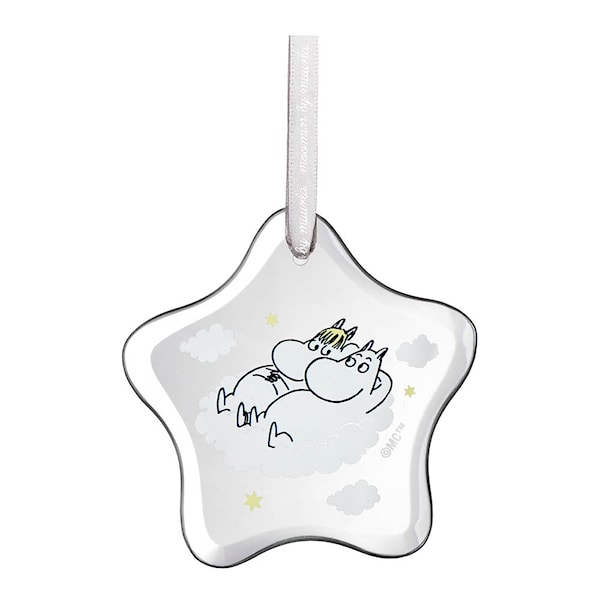 Mumin julpynt från Muurla är en stjärnformad glasprydnad på 8 cm med ett dekorativt motiv av Mumin och Snorkfröken. Med det medföljande satinbandet hängs detta julhänge smidigt upp i granen eller i fönstret och sprider en sagolik känsla i hemmet.