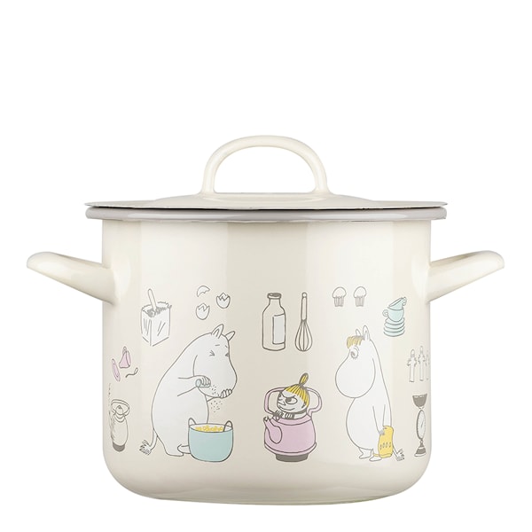 Mumin Kastrull med lock 2,5 L från Muurla är en beige emaljkastrull med lock och 2 praktiska handtag. Kastrullen är dekorerad med ett härligt Mumin motiv. Tillverkad i emaljerad kolstål som har mycket god värmeledningsförmåga.