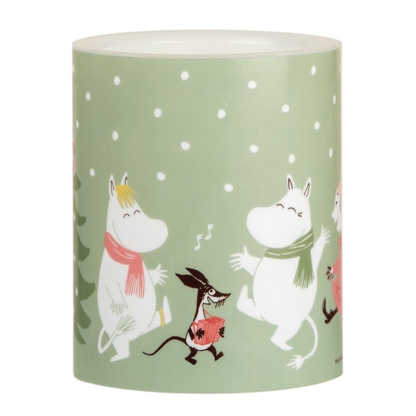 Mumin LED-ljus 12,5 cm Festlig stämning från Muurla är en stämningsfull ljuskälla som förgyller mörka timmar med sitt varma och inbjudande sken. Med ett vackert Muminmotiv sprider ljuset en glad och festlig atmosfär som skapar trivsel i hemmet. Tillverkat av paraffinvax, ger det ett autentiskt utseende samtidigt som LED-tekniken gör det säkert och hållbart. Ljuset drivs av 2 AA-batterier (ingår ej) och har en praktisk on/off-knapp samt en timerfunktion på 6 timmar. Perfekt för inomhusbruk, detta LED-ljus kombinerar Muminvärldens charm med funktion och säkerhet för en mysig vinterstämning.