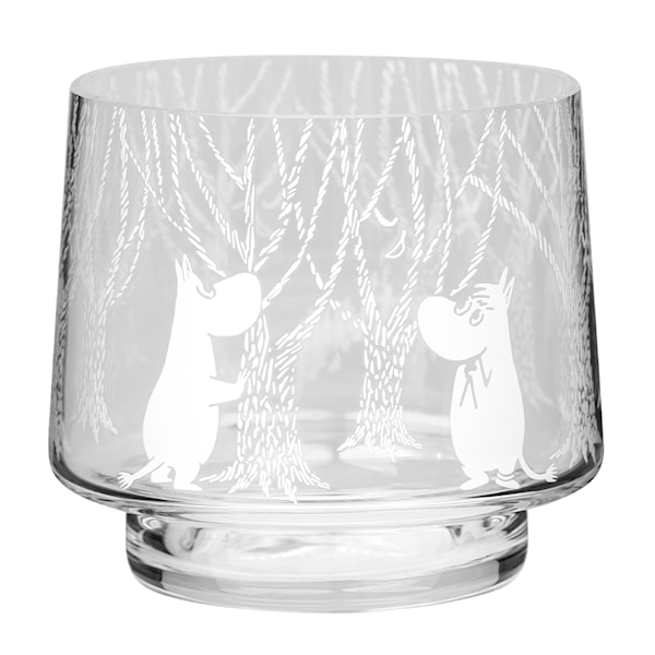 Glaset är varsamt blåst för att ge en mjuk och naturlig form, och den tål endast handdisk. Placera den i vardagsrummet, köket eller barnrummet – oavsett miljö sprider den ett varmt ljus och en dos Muminmagi. Under vintern skapar den stämning med levande ljus, och resten av året fungerar den lika fint som en liten serveringsskål, vas eller dekoration.