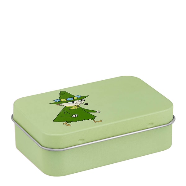 Muurla Mumin plåtburk Snusmumriken 10x6,5 cm grön är en liten men användbar förvaringsburk med gångjärnslock, perfekt för dina minsta men kanske viktigaste saker. Motiv av Snusmumriken i en lugn grön ton gör den lika dekorativ som funktionell.