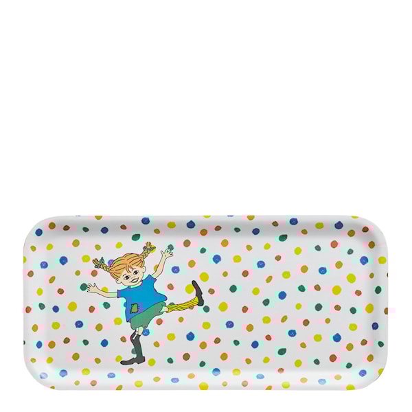 Här kommer Pippi Långstrump - tjolahopp tjolahej tjolahoppsansa! De färgglada prickarna i Hoppsansas design passar Pippi perfekt. Muurlas brickor är handgjorda i Finland av björkfanér. Melaminlamineringen gör dem praktiska, hållbara och diskmaskinssäkra.