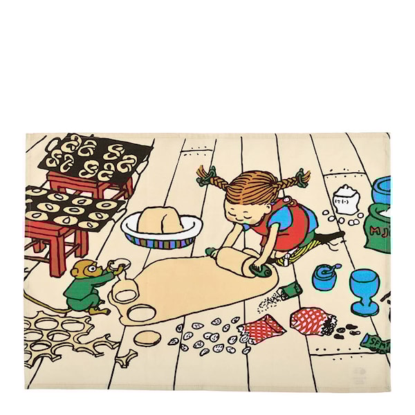 Pippi kökshandduk från Muurla mäter 50x70 cm och är tillverkad av 100% bomull som tål att tvättas i 60 grader. Handduken pryds av ett lekfullt motiv från Pippi Långstrump och fungerar lika bra som ett praktiskt inslag vid matlagningen som en dekorativ bonad på väggen.