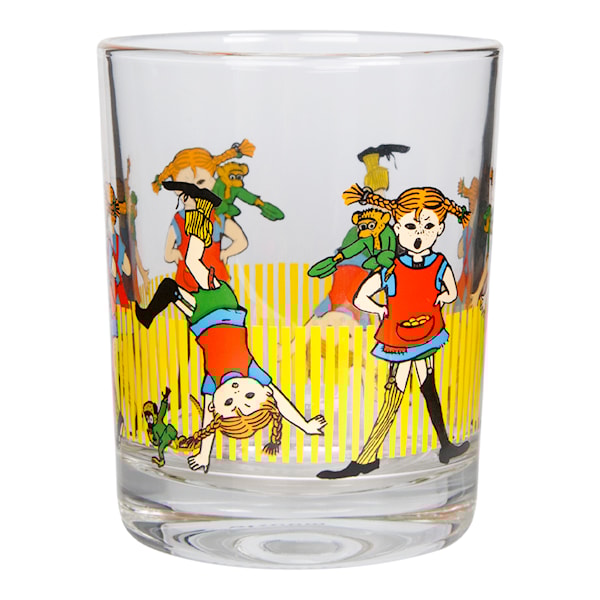 Lekfullt dricksglas från Muurla med motiv inspirerat av Astrid Lindgrens älskade berättelser om Pippi Långstrump. Här ses Pippi på glada upptåg tillsammans med Herr Nilsson. Volym 2 dl.