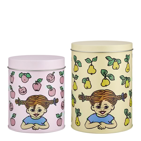 Pippi plåtburk 2-pack 11x17 cm "Frukter gul/rosa" från Muurla är ett praktiskt och charmigt set med två burkar med lock. Perfekta för förvaring av allt från godsaker och torrvaror i köket till pennor, pärlor eller små leksaker i barnrummet.