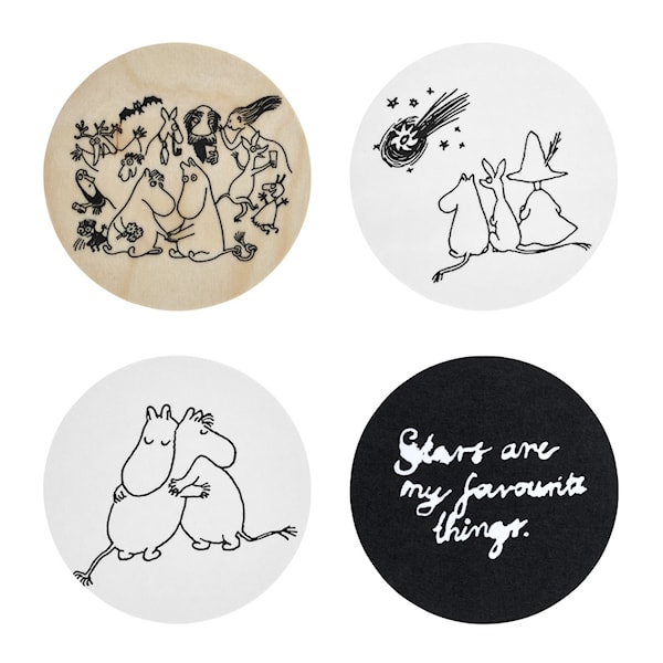 Set med 4 st olika underlägg av björkfanér med laminering. Förpackade i en plåtask, som också kan användas separat.