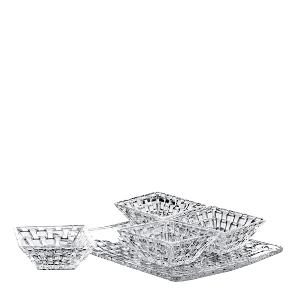 Bossa Nova-serien i glas från Nachtmann med det karaktäristiska flätade rutmönstret, här i ett serveringsset på fem delar. Bossa Nova serveringsset innehåller en tallrik och fyra skålar. Ett set som gör det enkelt att presentera och servera med stil. I Boss Nova-serien hittar du flera produkter i olika modeller och storlekar som du kan komplettera med.