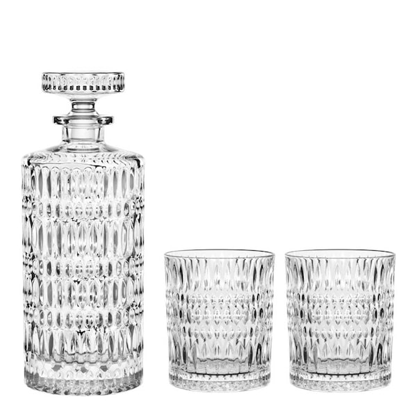 Nachtmann Ethno dekanteringsset 3 delar förenar klassisk servering med ett dekorativt och modernt uttryck. Setet består av en karaff och två glas, där det ikoniska Ethno-mönstret skapar struktur och ett levande samspel med ljuset.
