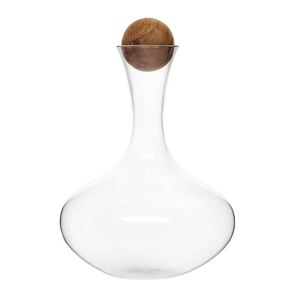 Glaskaraff med en kulformad kork i ek som pryder sin plats på det dukade bordet. Karaffen är framtagen för rödvin men kan självklart även användas till läskande drycker, vatten eller till och med som vas för favoritblommorna. Volym 2 liter.