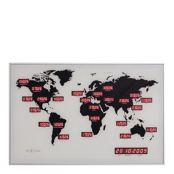 World Time Digit från NeXtime är en futuristisk väggklocka i elegant glasutförande som visar tiden för 22 olika städer – från New York till Tokyo – i en tydlig LED-display. Utöver global tid visar den även datum och år för din lokala tidzon. Den medföljande EU-adaptern med 1,8 m lång sladd ger enkel installation.