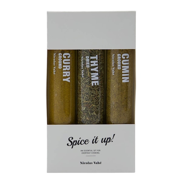 Nicolas Vahé kryddset innehåller tre favoriter: curry, timjan och spiskummin. En kombination som ger mångsidighet och inspiration till både vardagsmaten och helgens festmåltider.