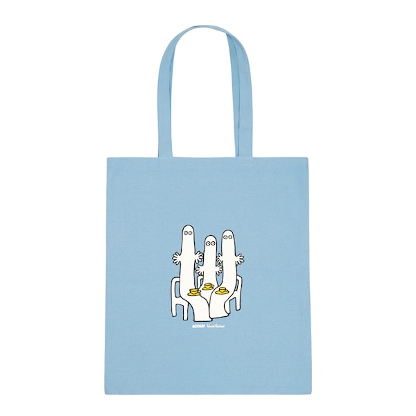 Mumin tygkasse 38,5x42 cm Hattifnattarna ljusblå från Nordicbuddies. Denna tygkasse med sitt ljusblå design och en charmig illustration av Hattifnattarna som njuter av te är ett funktionellt och elegant val för vardagen. Med måtten 38,5 x 42 cm erbjuder den gott om plats för dagligvaror, böcker eller andra nödvändigheter. På baksidan finns Nordicbuddies-logotypen som ger en ren och modern avslutning.