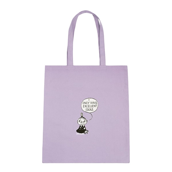 Mumin tygkasse 38,5x42 cm Lille My lila från Nordicbuddies. Denna tygkasse i en energisk lila färg kombinerar funktionalitet och stil på ett perfekt sätt. Framsidan pryds av en livlig illustration av Lille My med texten "excellent ideas", vilket ger en humoristisk och personlig touch. Med måtten 38,5 x 42 cm erbjuder kassen gott om plats för dagligvaror, böcker eller andra nödvändigheter, medan Nordicbuddies-logotypen på baksidan tillför ett modernt och rent uttryck.