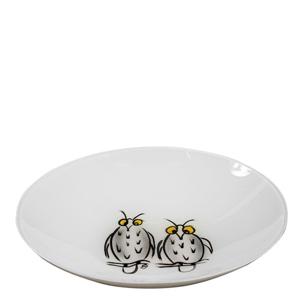 Fat från Nybro Crystal, handmålade ugglor med inspiration från skogarna i Glasriket formgiven av Lena Sonesson.