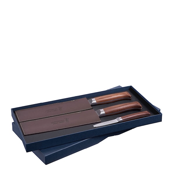 Trio knivset Les Forges från Opinel består av tre oumbärliga köksknivar – en kockkniv, en trancherkniv och en skalkniv. Knivarna är smidda ur ett enda stycke rostfritt stål och erbjuder styrka, balans och skärpa i varje snitt.