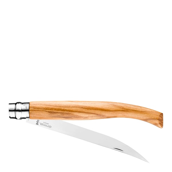 Nomad N15 fällkniv från Opinel i olivträ är ett utsökt exempel på skönhet och funktion. Det 15 cm långa spegelpolerade bladet i rostfritt stål är både tunt och följsamt – perfekt för filetering av fisk och finare snitt.