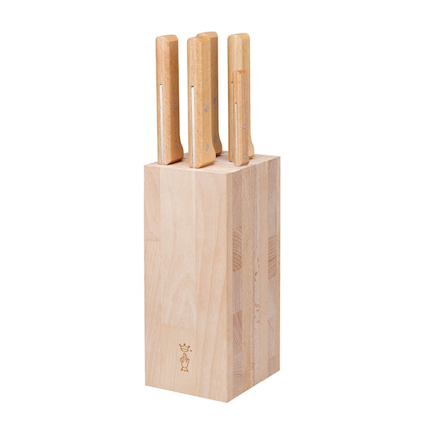 Blocket i bokträ är inspirerat av Opinels ikoniska handtagsdesign och är både lätt att rengöra och stabilt tack vare sina genomgående spår och halksäkra silikonfötter. Ett elegant och praktiskt set för dig som vill ha ordning och kvalitet på köksbänken.