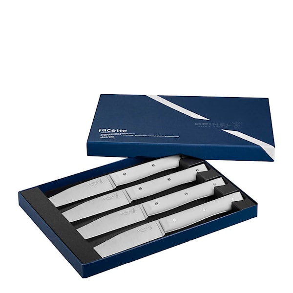 Besticksetet Table Bois Facette 4 delar vit från Opinel kombinerar bistrocharm med framtidens material. VittEr®-handtagen är fukttåliga, tåliga och tillverkade av pressat papper – ett miljövänligt val som klarar diskmaskin.