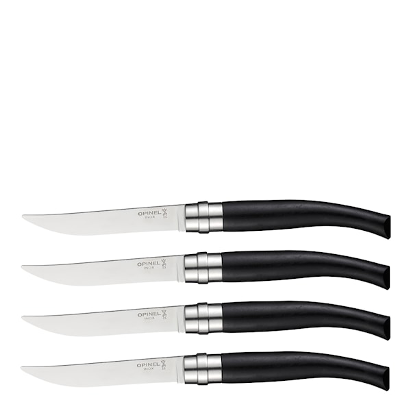 Table Bois Table Chic bestickset 4-pack från Opinel i olivträ förenar hantverkskvalitet med en sofistikerad bistrokänsla. Yatagan-bladen i rostfritt stål ger en vass och hållbar egg, medan de ergonomiska olivträhandtagen ger naturlig elegans.
