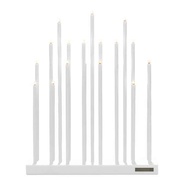 Elflugan Grande från Smak Design är en modern ljusstake med tydlig form och karaktär, som fungerar lika väl året runt som under advent. Den är 50 cm bred och 12,5 cm djup, målad i vitt och försedd med nitton små ljuspunkter som tillsammans ger ett milt och behagligt sken. Kombinationen av symmetri, mjuk ljusbild och stram enkelhet har gjort Elflugan till en självklar favorit i många hem.