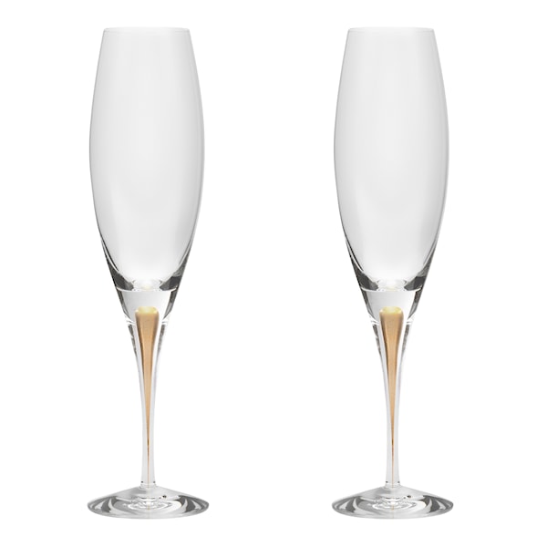 Champagneglas från Orrefors. Intermezzo guld medför en festlighet till hela kollektionen och förgyller varumärkets
