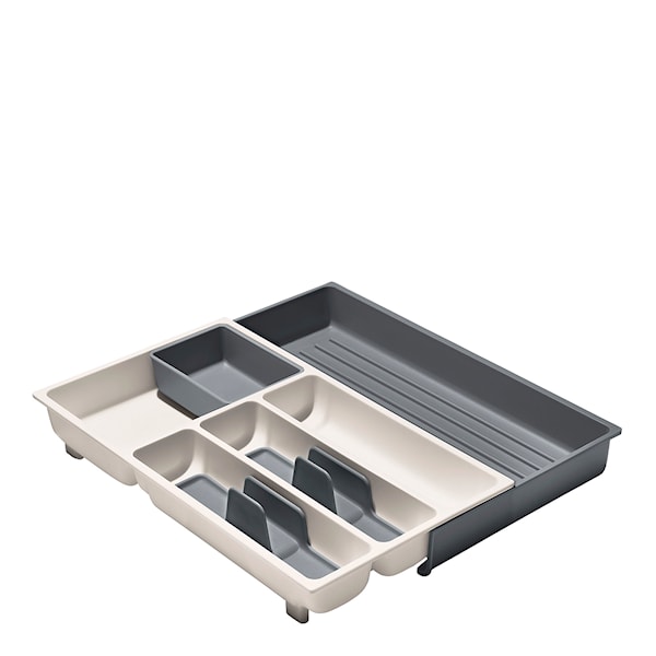 OXO:s justerbara besticklåda hjälper dig att hålla ordning i dina lådor, oavsett lådstorlek. Besticklådan sparar plats genom att hålla redskapen fint åtskilda och det stora området är idealiskt för oregelbundet formade köksredskap, till exempel burköppnare. En avtagbar skål för mindre saker som kan vara svåra att hålla ordning på, såsom vinproppar och majshållare ingår. De halksäkra fötterna håller lådan på plats när du öppnar och stänger kökslådan och de fyrkantiga hörnen eliminerar hål och maximerar platsen, vilket ger ett rent utseende i dina kökslådor. De små avskiljarna är avtagbara för noggrann rengöring och lätt dukning.