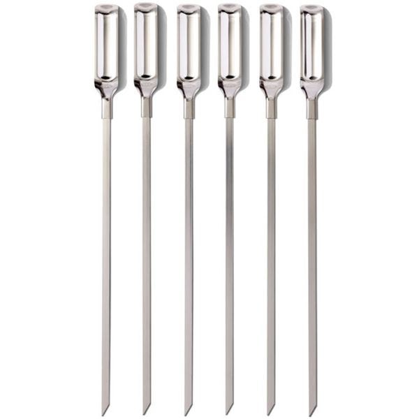 Grillspett 6-pack Rostfri från OXO. Bitar av kött och grönt glider lätt på spetten från den vassa spetsen, och den platta designen håller maten stabil under tillagningen.