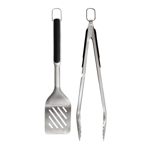 Good Grips Grilltång och Grillstekspade Rostfri från OXO är ett set med grilltång och grillstekspade. Båda är tillverkade i borstat rostfritt stål med behagligt handtag i halkfritt gummi.