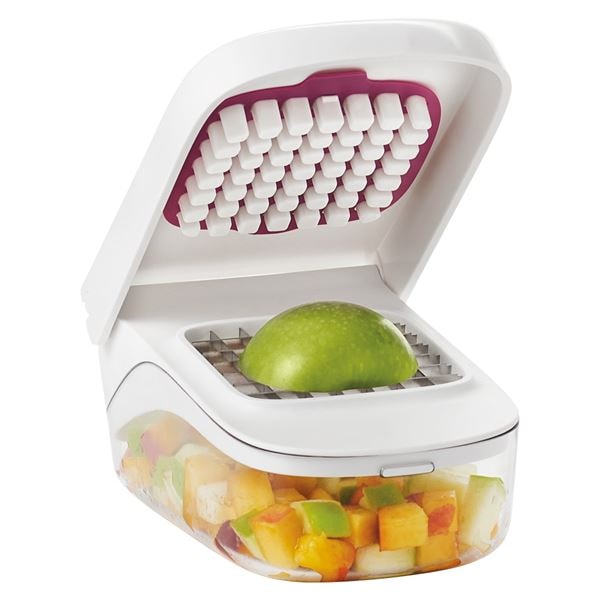Skär frukter och grönsaker på ett roligare och lättare sätt med denna grönsakshackare från Oxo. Hacka frukt och grönt utan att behöva ta upp vare sig kniv eller skärbräda och spar tid i köket. Använd grönsakshackaren genom att placera frukten eller grönsaken på knivbladet och tryck sedan ner locket. Den hackade råvaran faller direkt ner i behållaren, därefter kan du enkelt hälla över råvaran till stekpannan, kastrullen eller skålen via öppningen på sidan. Effektivt, smidigt och tidssparande!