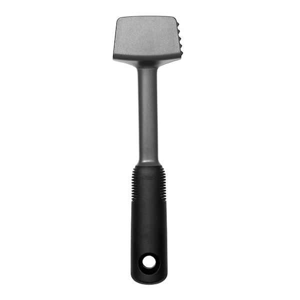 Köttklubban från Oxo har en strukturerad sida och en plan sida för att både kunna banka köttet mört och tunt. Tyngden och vinkeln på själva klubbhuvudet gör att du bankar ut köttet enkelt och handtaget i mjukt gummi ligger bekvämt i handen och är utformat för att fånga upp skakningar som tillkommer under användningen och är därmed skonsam mot handlederna. En behändig och stabil köttklubba tillverkad i kolstål belagt med ABS-plast. Tål diskmaskin.